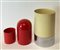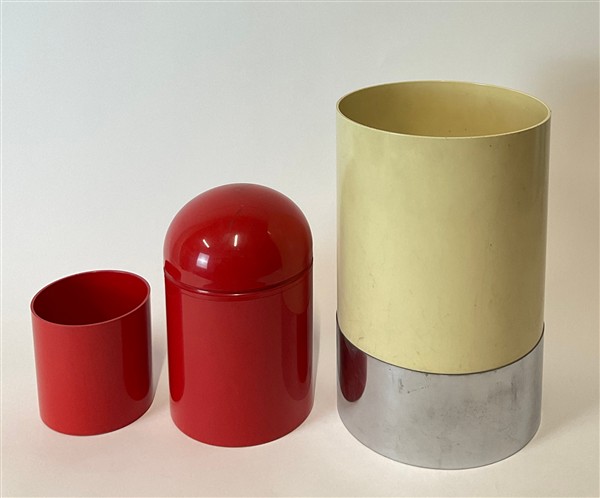 Lotto composto da un gettacarte di Gino Colombini in plastica bianca con fascia in metallo e due contenitori di Anna Castelli in plastica rossa diversi cestini. Produzione Kartel, Italia, anni '70. (h max cm 38) (difetti)
