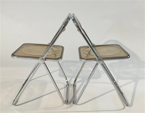 Coppia di sedie modello "Plia". Produzione Anonima Castelli, Bologna, anni '70. Tubolare in alluminio cromato, seduta e schienale in materiale plastico Cellidor. Recante marchio. (cm 47x50) (difetti e mancanze)