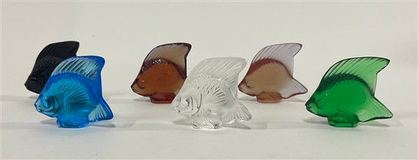Gruppo di sei piccole sculture a forma di pesce in vetro soffiato in stampo di diversi colori. Firmati a punta "Lalique France" alla base. (cm 5,5x5)
