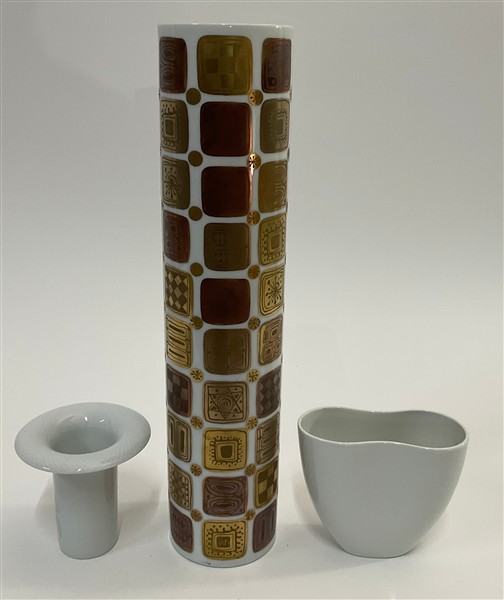 Lotto composto da un vaso di forma cilindrica in ceramica smaltata bianca e decorata a motivi geometrici color oro e bronzo della serie "Quatre couleurs" di Bjorn Wiinblad (cm 41) e un vasetto in ceramica bianca decorata da gardenia di Tapio Wirkkala (h cm 10). Uniti a un vasetto con corpo schiacciato in ceramica bianca monocroma (h cm 11). Germania, seconda metà secolo XX.