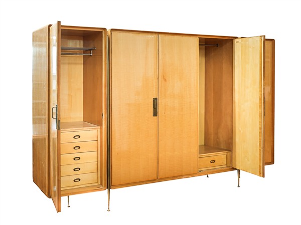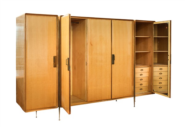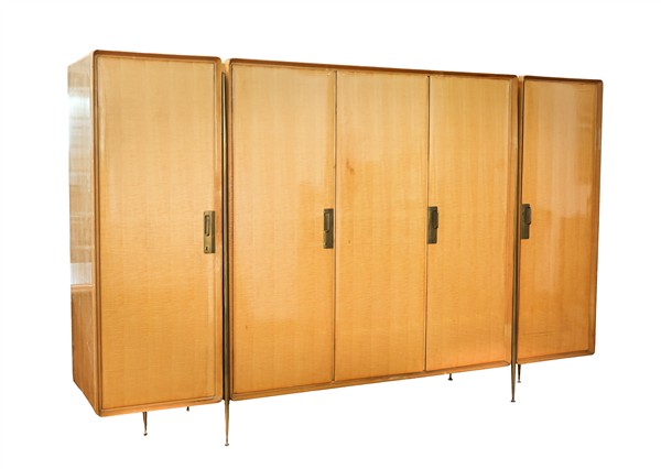 Armadio a cinque ante. Torino, anni '50/'60. Corpo in legno massello e impiallacciato chiaro, montanti tubolari in ottone, maniglie in ottone. (cm 296x185x64) (difetti, mancante delle chiavi)