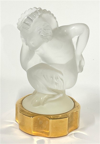 Tappo per radiatore in vetro pressato a forma di Fauno in base bronzo dorato. Francia, anni '80/'90. In scatola originale. (h cm 13,5) (mancanze)