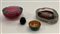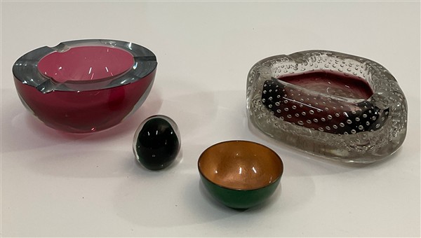 Piccola ciotolina in rame smaltato verde e bronzo con etichetta in alluminio applicata sotto la base (d cm 6,5) unito a un posacenere in vetro sommerso trasparente e ametista con inclusione di bolle disposte regolarmente, un posacenere di produzione nordeuropea in vetro sommerso trasparente e ametista chiaro iscritto a punta sotto la base e una piccola sfera in vetro sommerso trasparente e verde smeraldo (d max cm 16).