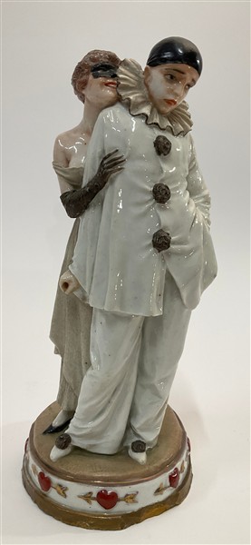 Gruppo in porcellana policroma raffigurante Pierrot e damina mascherata. Italia, prima metà secolo XX. Simbolo grafico della manifattura sul fondo. (h cm 26,5) (lievi difetti e restauri)