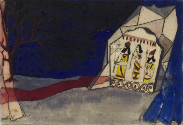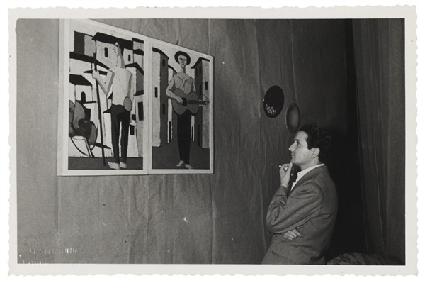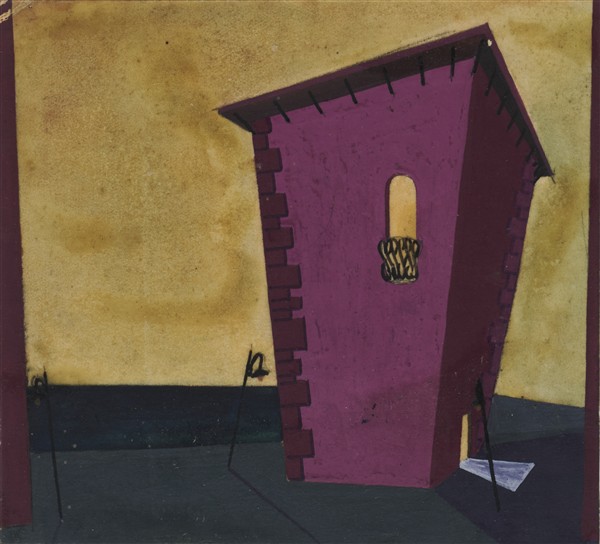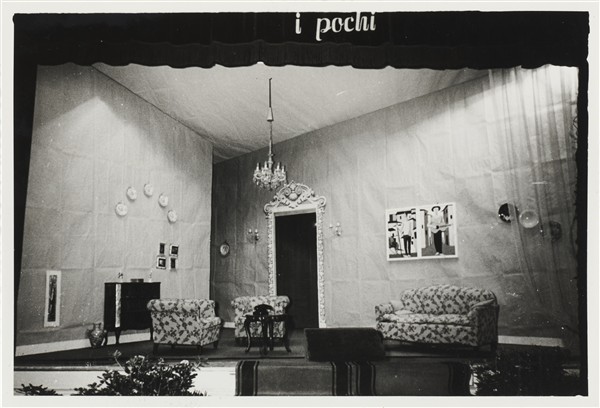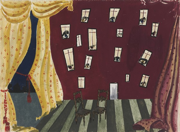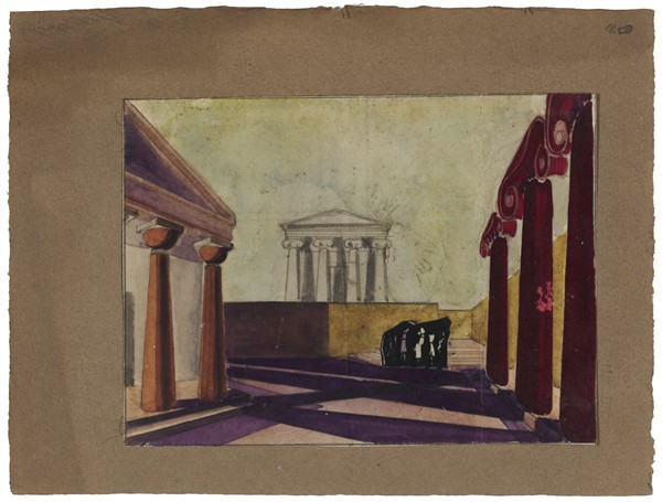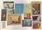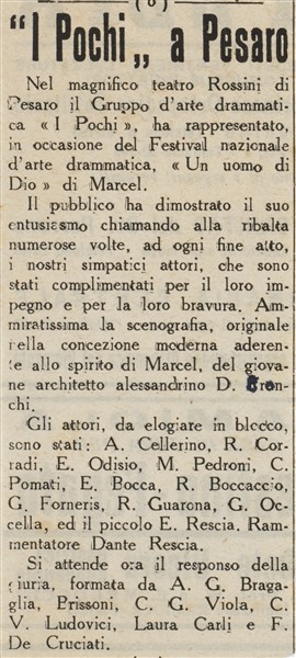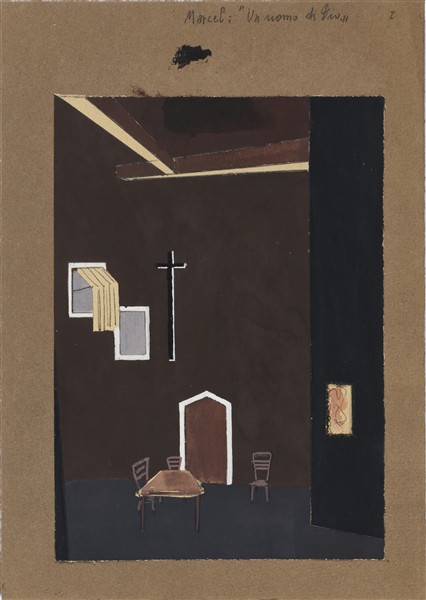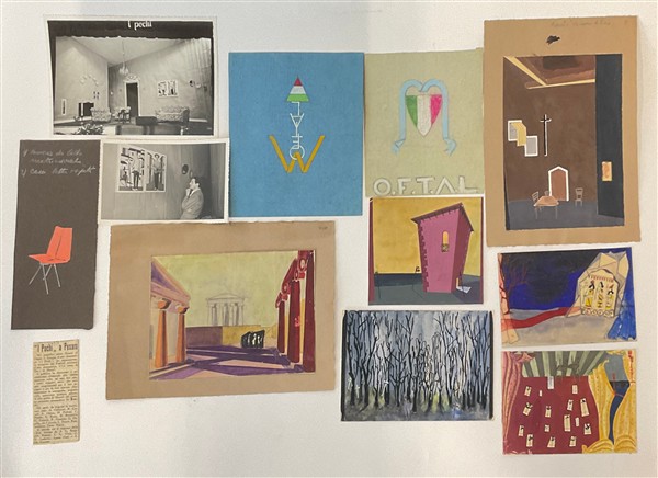 Cartella con due foto, un ritaglio di giornale e nove bozzetti, tra cui quelli di D. Gronchi per le scene dell'opera teatrale "Un uomo di Dio", di Marcel. Tecnica mista su carta, stampe fotografiche. (lievi difetti)