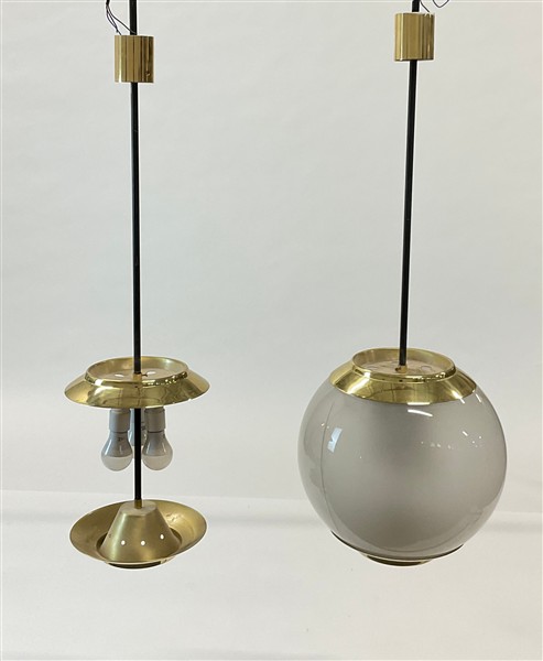 Una lampada a sospensione e una struttura modello "LS2". Produzione Azucena, Milano, 1952. Ottone e vetro satinato sulla superficie interna. (h cm 120) (difetti)