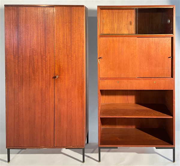 Due mobili in legno e teak impiallacciato, uno a due ante e l'altro a quattro ante scorrevoli di cui due in cristallo sopra due tiretti e due scomparti. Gambe e pomelli in metallo verniciato nero. (cm max 80,5x162,5x41) (difetti e mancanze)