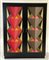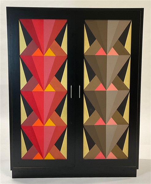 Armadio moderno in legno laccato nero con ante rivestite in tessuto dipinto a soggetto astratto. Produzione recente. Firmato in un'anta in basso. (cm 138x181,5x50) (lievi difetti)