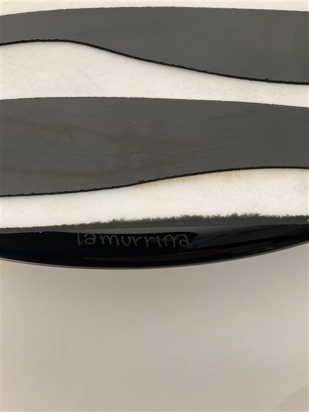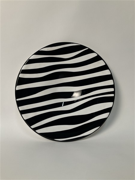 Grande piatto in vetro incamiciato lattimo e nero decorato a scavo a motivo zebrato. Murano, seconda metà secolo XX. Firmato a punta sul bordo. (d cm 37)