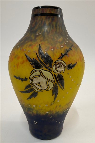 Delatte Vaso in vetro policromo smaltato con decoro a fiori su sfondo giallo e v