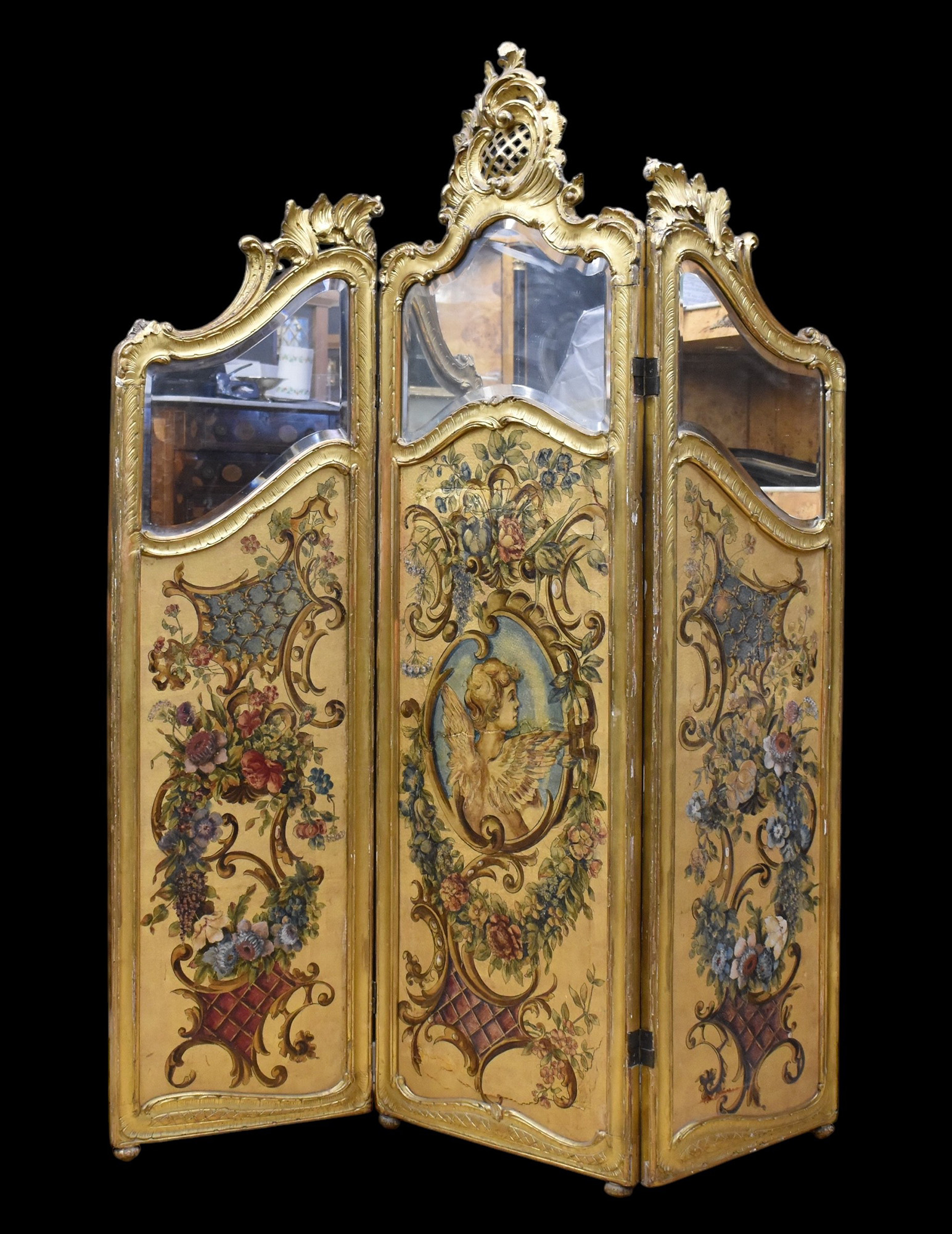Paravento a tre ante in legno dorato con cuoio dipinto sec. XIX
