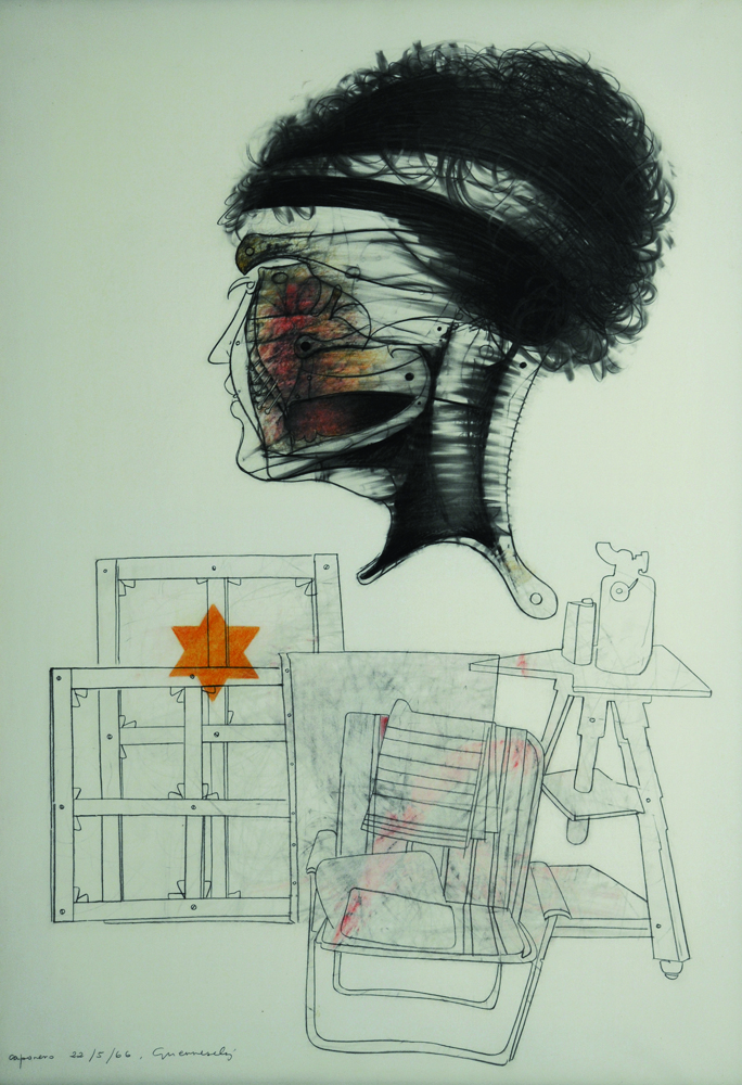 Firmato, datato. GIUSEPPE GUERRESCHI (1929 – 1985) - " Caponero ", 1966, Tecnica mista su carta telata, cm. 102 x 73. Firmato e datato in basso a sinistra. Pubblicato sul cat. " Judaica ". Prov. Collezione Privata