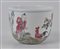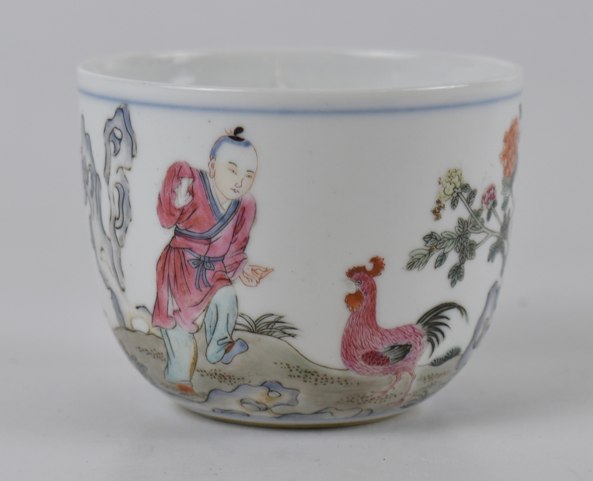 Cina tazzina in porcellana dipinta con personaggio con gallo e scritte