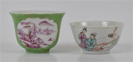 2 ciotole in porcellana una fondo verde h 5 5 l'altra decorata con personaggi h 4 cm