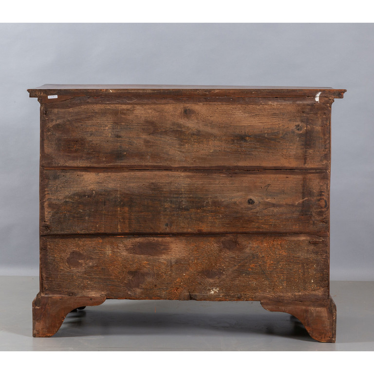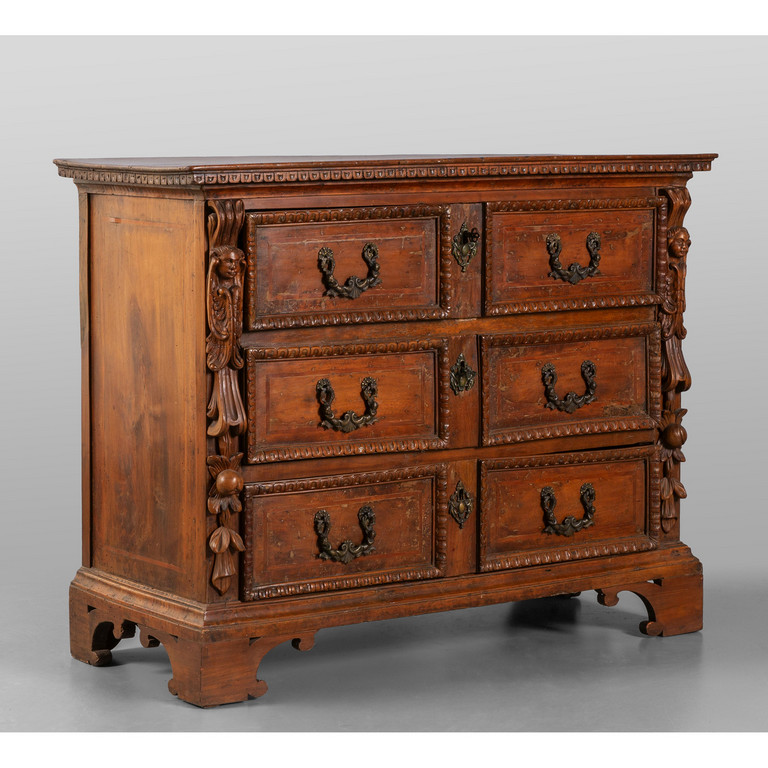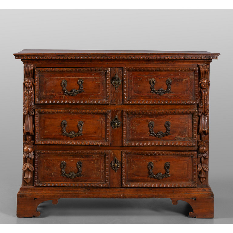 Comò Luigi XIV a tre cassetti in noce il primo celante calatoia montanti scolpiti a motivi di angeli ed elementi vegetali Lombardia inizi sec.XVIII