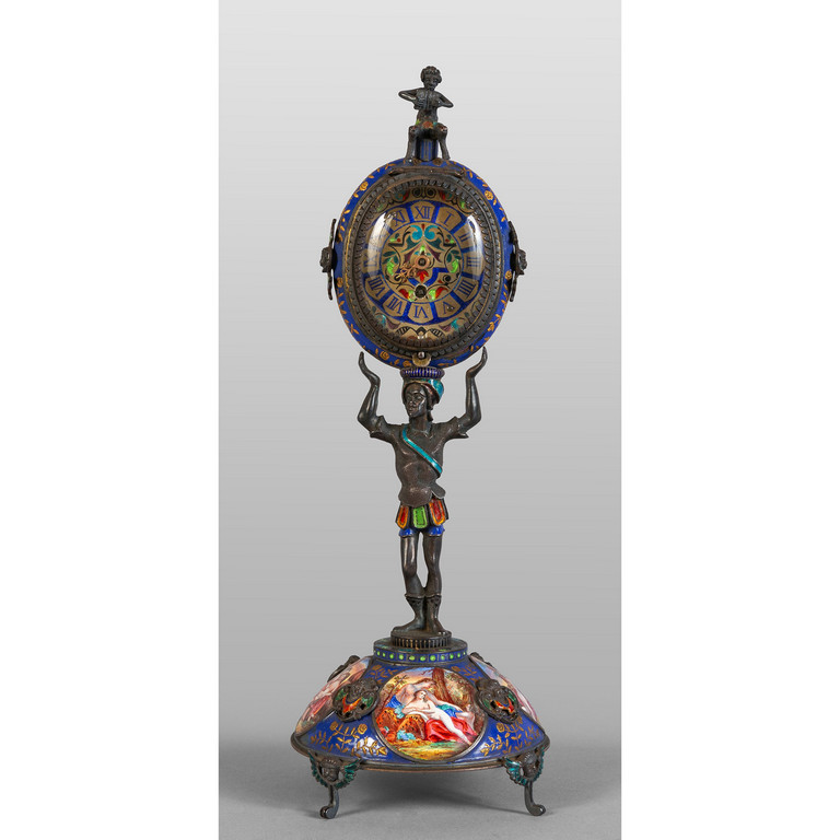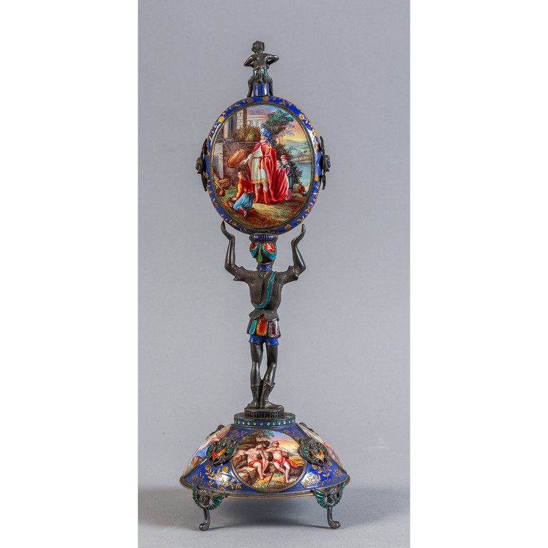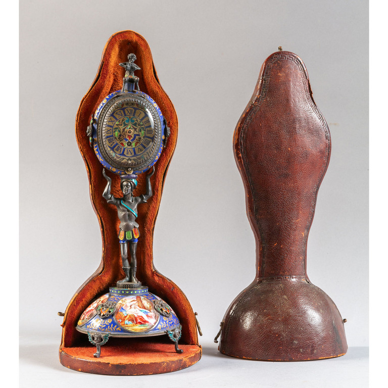 Orologio da tavolo in argento decorato con smalti policromi Vienna sec.XIX nella sua custodia originale in pelle