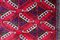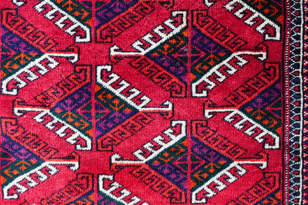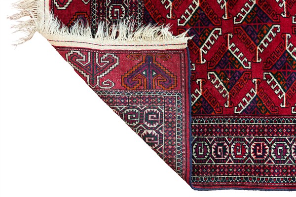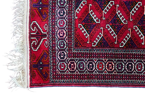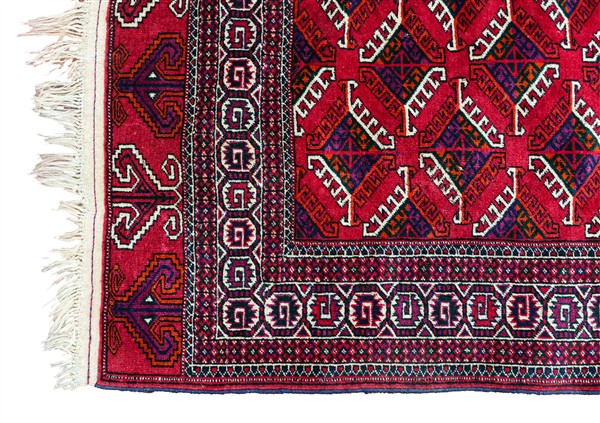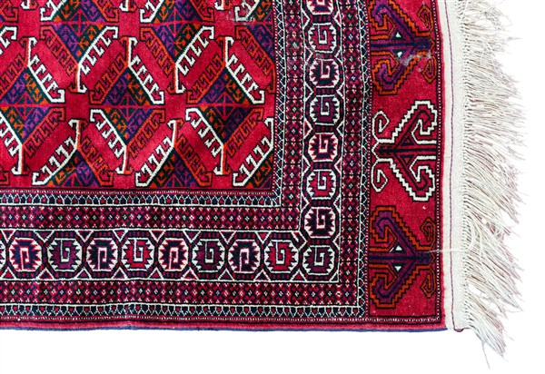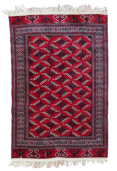 Tappeto Yomut, Turkestan occidentale, secolo XX. Decoro con Memling Gul su fondo rosso. Bordura con G Gul su fondo bianco. Alle due testate una fascia con motivo Kotchiak (cm 201x133) (difetti)