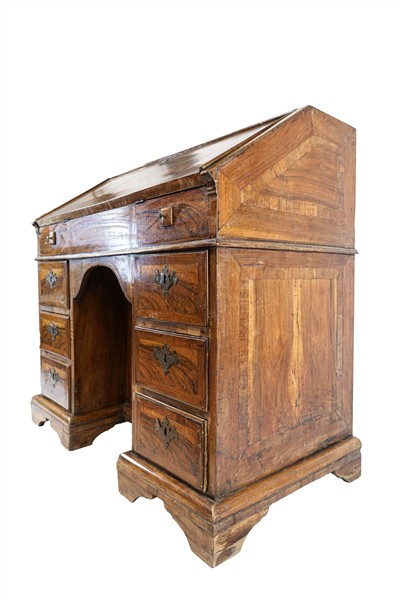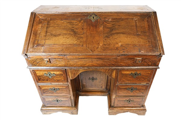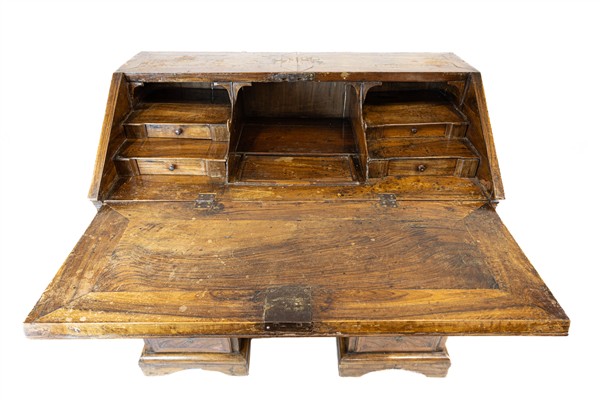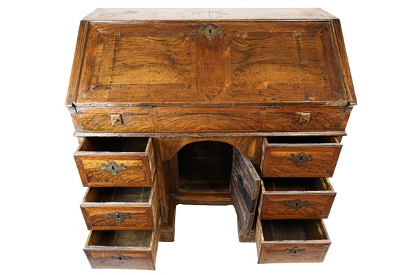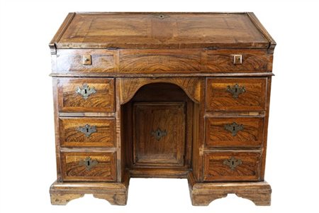Scrittoio da parete impiallacciato in noce e radica di noce, fronte a sei cassetti e uno sportello, calatoia celante quattro tiretti, vani a giorno e segreti. Secolo XVIII-XIX (cm 118x109x62) (difetti e restauri)