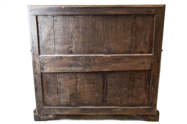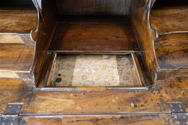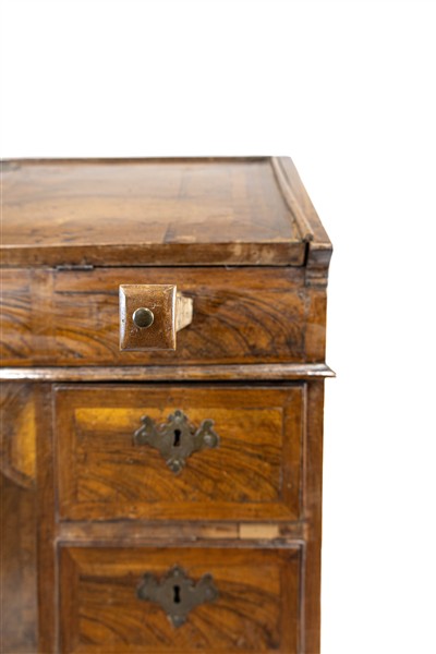 Scrittoio da parete impiallacciato in noce e radica di noce, fronte a sei casse