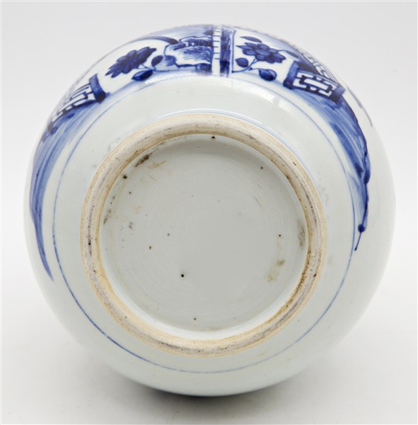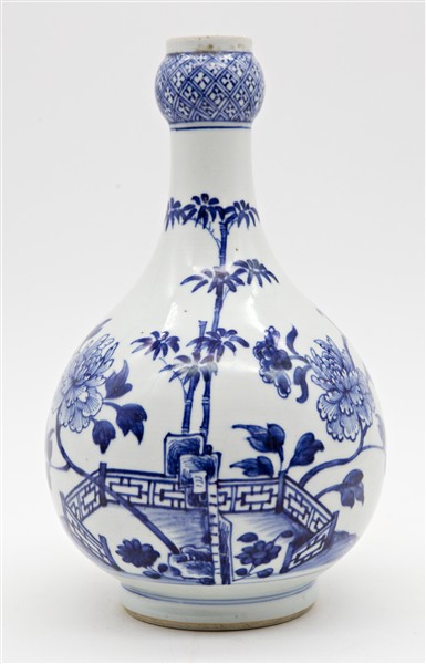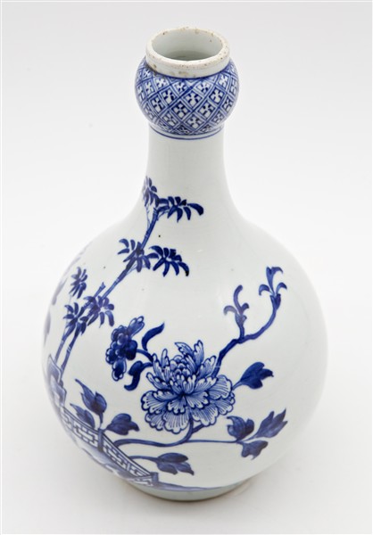 Vaso in porcellana bianca e blu con decoro floreale ed architettura