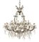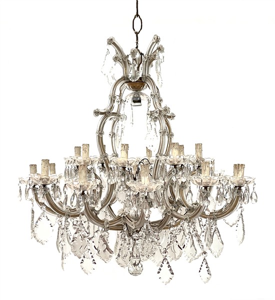 Lampadario a ventuno luci in stile Maria Teresa con struttura in metallo rivestito in vetro, bracci raccordati da catenelle e pendenti sagomati (h cm 90 più catena, d cm 88) (difetti e piccole mancanze)