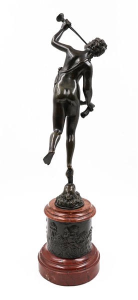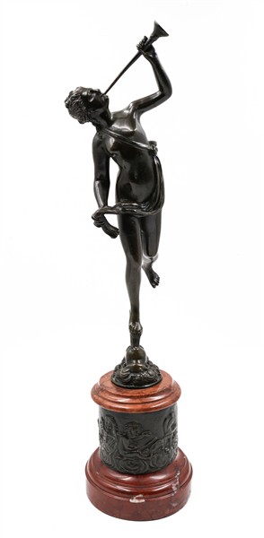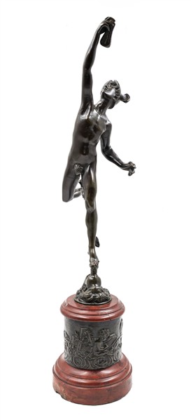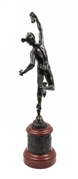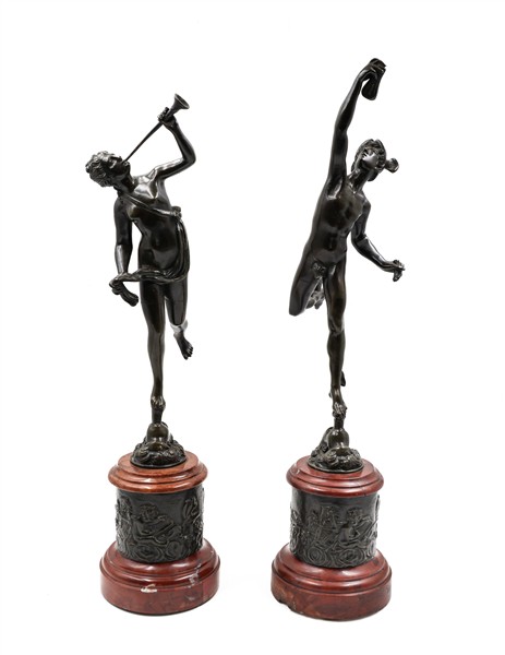 Fonditore del secolo XIX-XX, da Giambologna. Mercurio volante e la Fama, due sculture in bronzo patinato su sostegno a semicolonna con fascia in bronzo a figure classiche e parti in marmo rosso (h cm 56) (difetti e piccole rotture)