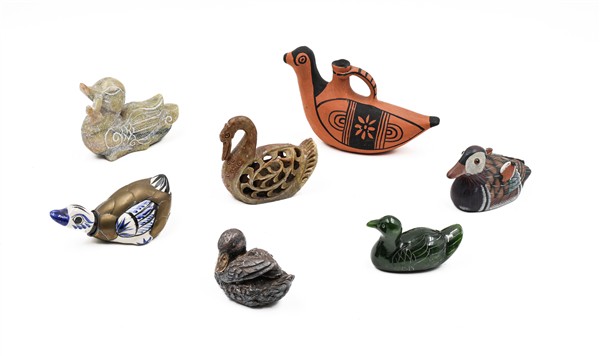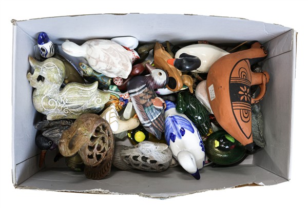 Scatola contenente numerose anatre souvenir in miniatura di manifatture differenti in vetro, pietra dura, ceramica ed altri materiali (difetti)