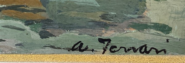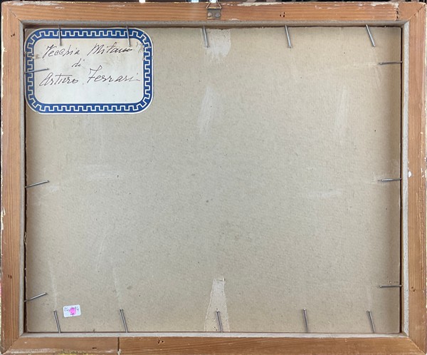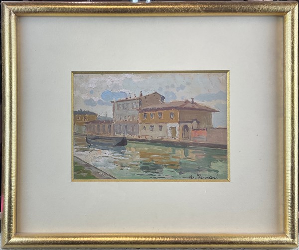 Arturo Ferrari "Naviglio" olio su cartone (cm 14x20) firmato in basso a destra