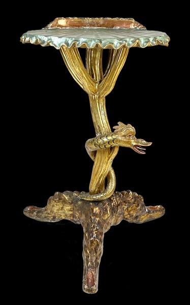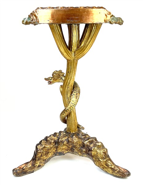 Gaetano Recchia, Verona, inizio secolo XX. Tavolino in legno intagliato, laccato e dorato, sostegno tripode a tronco con serpe, piano a valva di conchiglia. Etichetta cartacea su fondo del piano (cm 49x84x44) (difetti e mancanze)