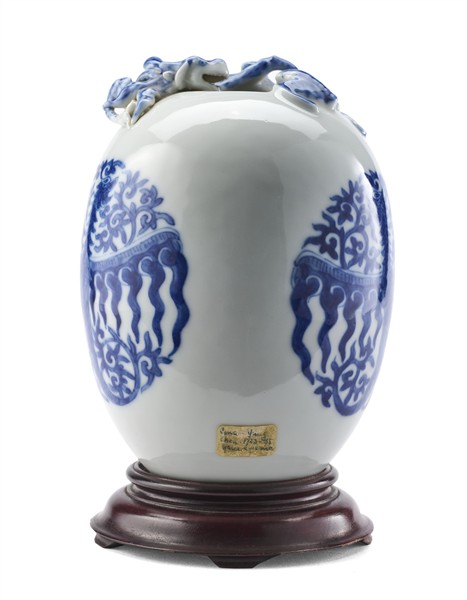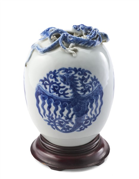 Vaso in porcellana bianca e blu dalla forma ovoidale il corpo decorato decorato con fenice ed il collo con drago e pipistrello a rilievo recante marchio apocrifo Yongzheng