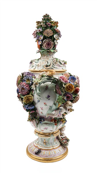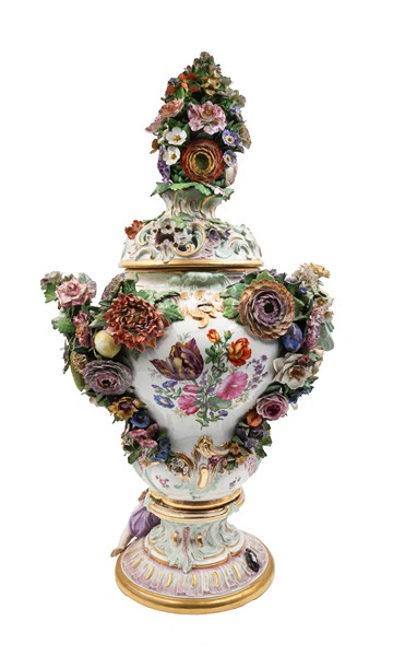 Manifattura di Meissen, secolo XIX. Grande vaso biansato con coperchio traforat