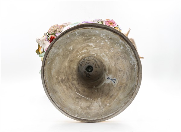 Manifattura di Meissen, secolo XIX. Grande vaso biansato con coperchio traforato di forma sagomata in porcellana dipinta in policromia con putti, fiori e insetti, anse a racemi fogliati (h cm 78) (difetti e restauri)