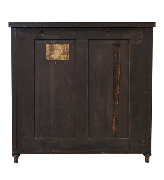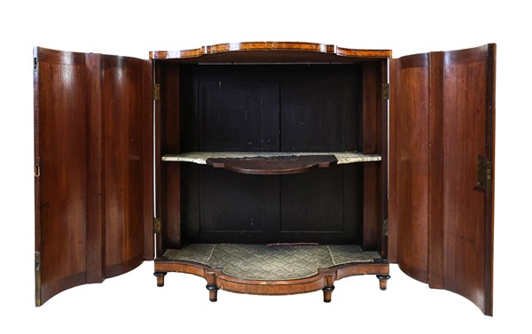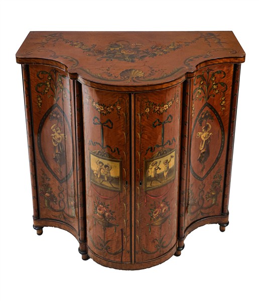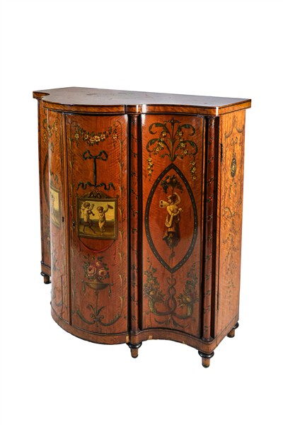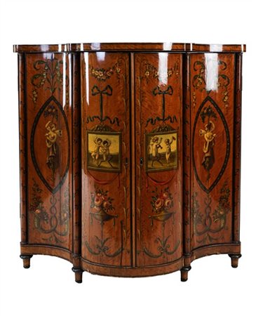 Credenzino impiallacciato in satinwood di forma sagomata e dipinto in policromia nello stile Sheraton a due ante, fronte con decori allegorici a figure, fiori, volute e valva di conchiglia. Inghilterra, secolo XIX (cm 87x82x48) (difetti)