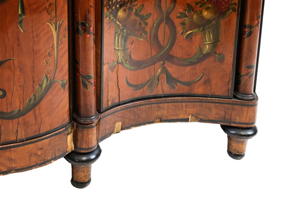 Credenzino impiallacciato in satinwood di forma sagomata e dipinto in policromi