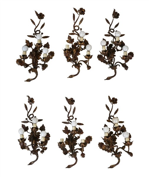 Gruppo di sei appliques a tre luci in ferro battuto dipinto e dorato con decoro
