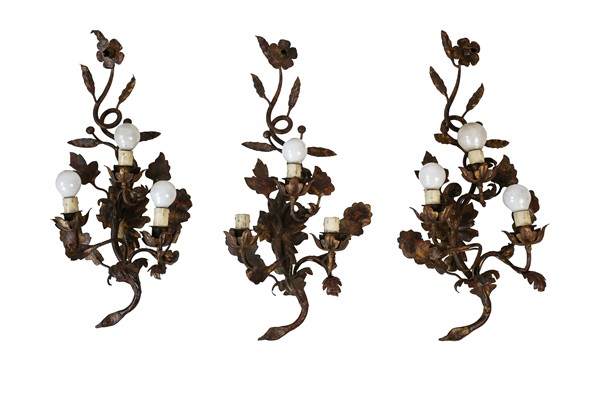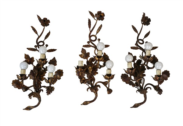 Gruppo di sei appliques a tre luci in ferro battuto dipinto e dorato con decoro a volute fogliate e fiori (h. cm 55) (difetti)