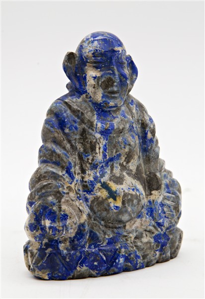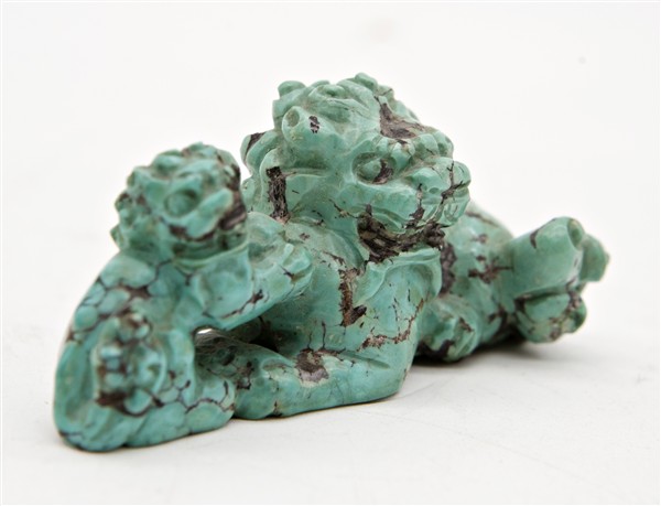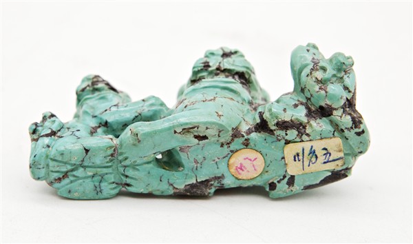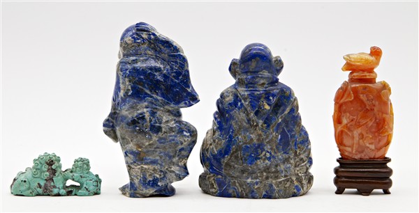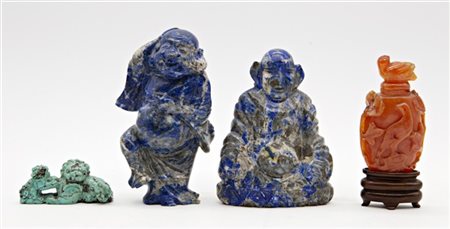 Lotto composto da una snuff bottle in pietra dura, un intaglio in turchese e due figure in sodalite