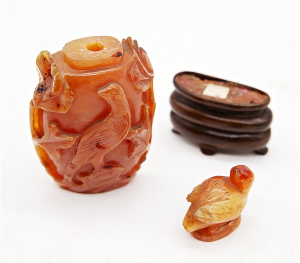 Lotto composto da una snuff bottle in pietra dura, un intaglio in turchese e du