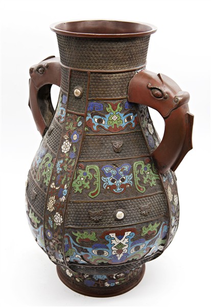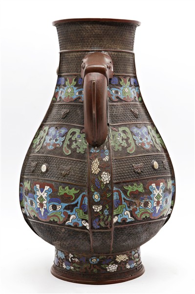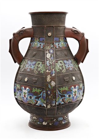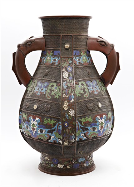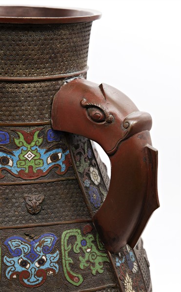 Vaso biansato in metallo cloisonné con decori stilizzati di maschere taotie, an