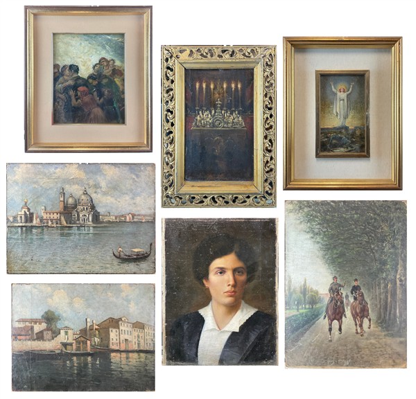 Lotto composto da sette dipinti di autori di fine secolo XIX e inizio secolo XX, ad olio su diversi supporti, di diversi soggetti e misure