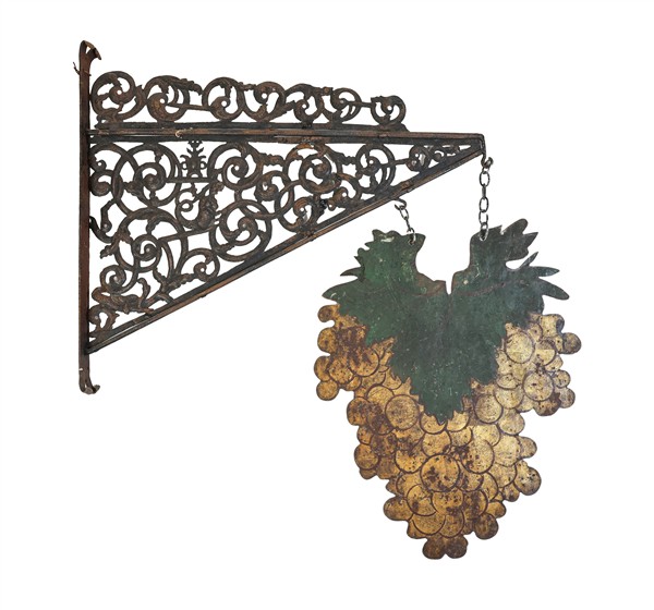 Lotto composto da un'insegna in ferro battuto e traforato con sagoma a grappolo