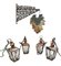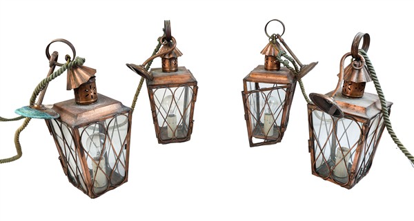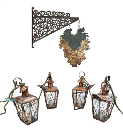 Lotto composto da un'insegna in ferro battuto e traforato con sagoma a grappolo d'uva (h tot cm 120) unito a quattro lanterne in rame (h cm 40) (difetti)