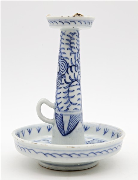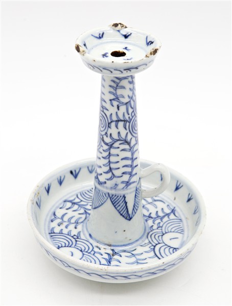 Portacandele in porcellana bianca e blu con decoro floreale stilizzato Cina, di
