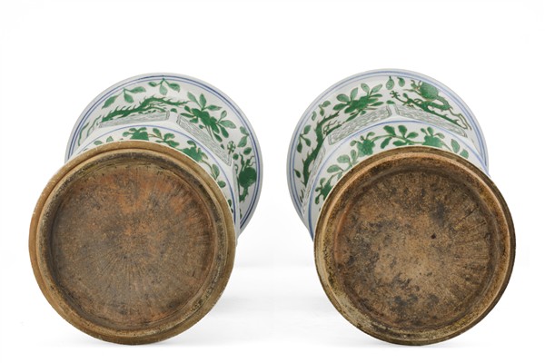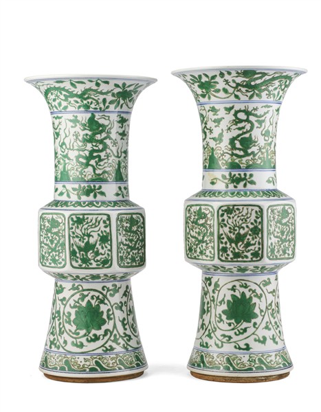 Due vasi gu in porcellana a fondo bianco decorati con draghi, fenici e fiori di loto in smalti verdi