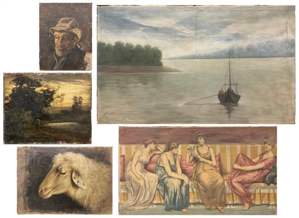 Lotto composto da cinque dipinti di diversi autori di fine secolo XIX e inizio secolo XX, di diversi soggetti, supporti e misure (cm max 73x123)