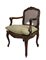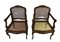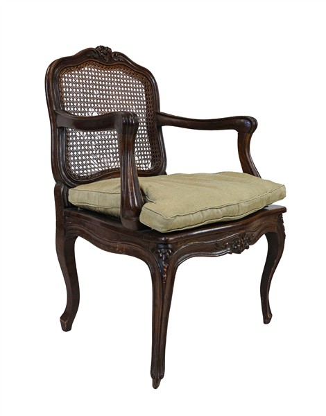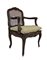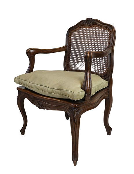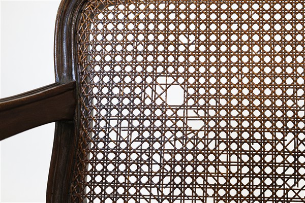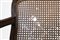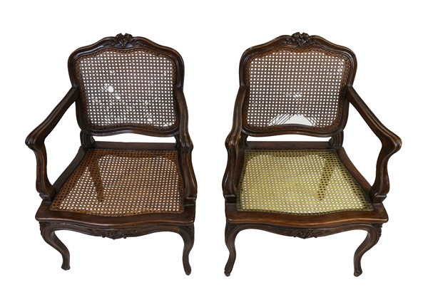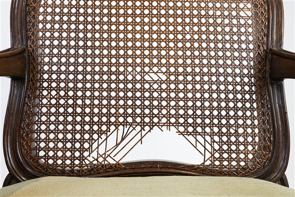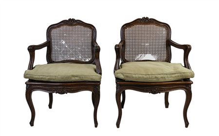 Coppia di poltroncine in noce scanalato con gambe e braccioli mossi, decorate da piccoli intagli, seduta e schienale in paglia di Vienna (difetti)