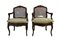 Coppia di poltroncine in noce scanalato con gambe e braccioli mossi, decorate d