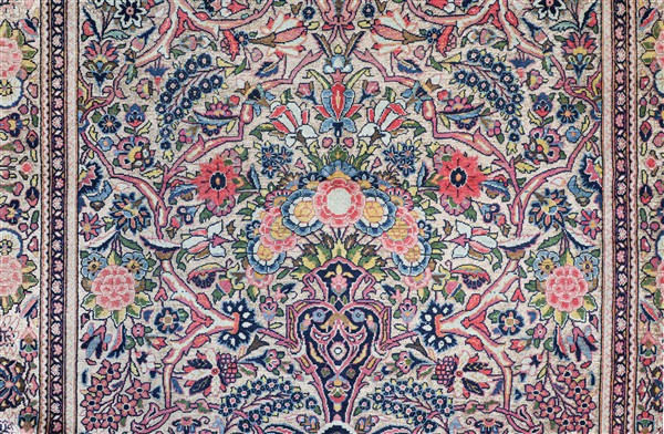 Tappeto preghiera Keshan, Persia, inizio secolo XX. Annodato in lana e seta. Decoro floreale tipo millefleur con vaso fiorito alla base (cm 215x136)