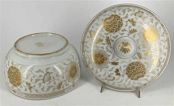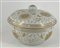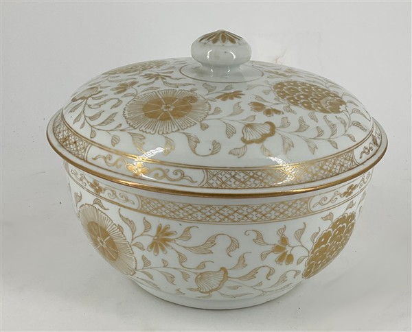 Manifattura del secolo XVIII-XIX. Ciotola con coperchio in porcellana bianca decorata in oro a motivo floreale