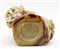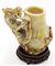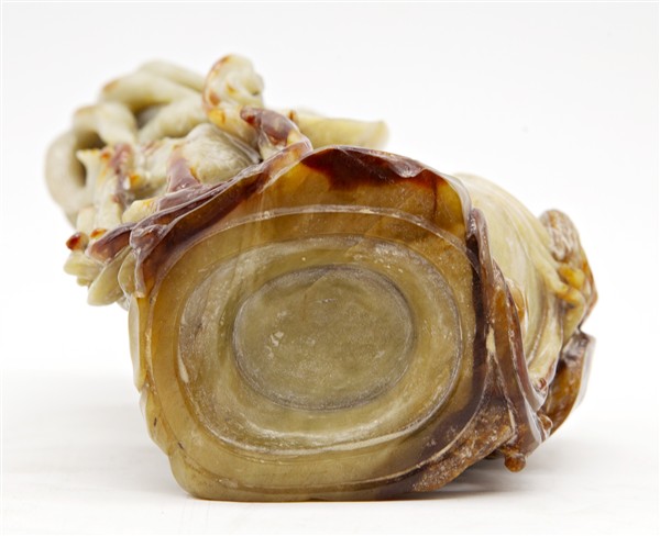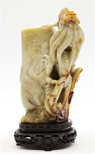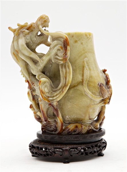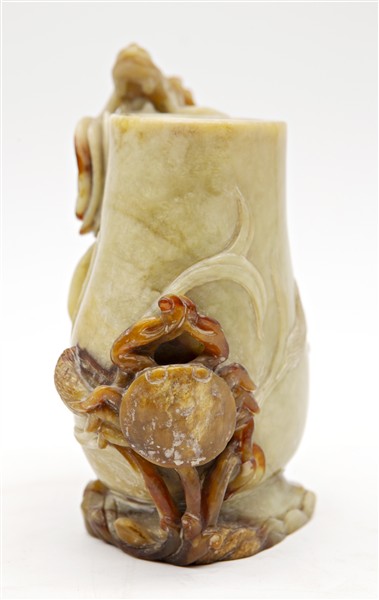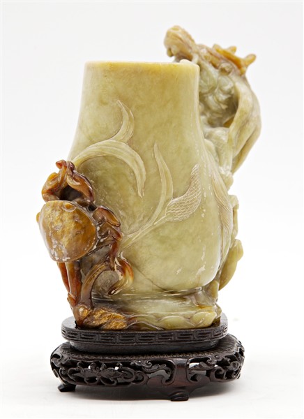 Vaso in pietra saponaria con decoro floreale a rilievo, ai lati un drago ed un granchio